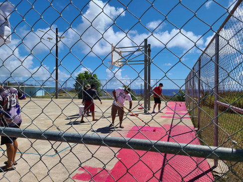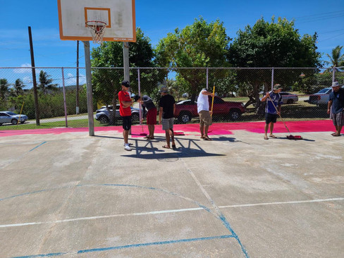 Office of Precinct 5 Representatives Richard Tudela Lizama, Leila Haveia Fleming Clark Staffler, and their volunteers adopted three basketball courts in Kagman. They transformed the courts by: 1) cleaning the areas in and around the courts, 2) painting the courts, 3) water blasting, and 4) replacing equipment and items that needed repair.
